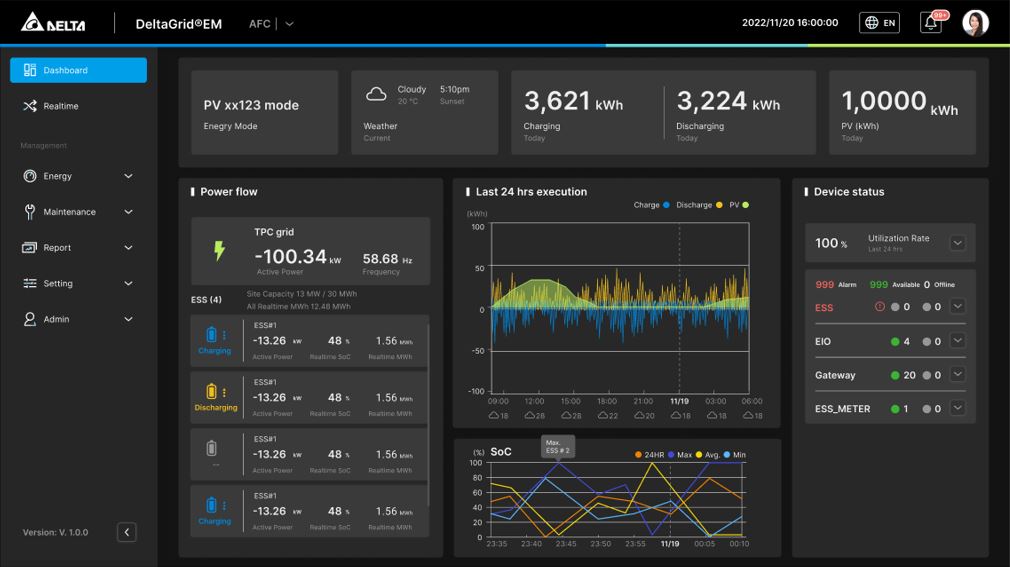 FBESSおよびCシリーズは、デルタ電子のEMS「DeltaGrid®」と組み合わせることで、ESSソリューションのマルチパーパス利用を促進します。また、高度な電力市場取引に対応するEMSとリソースアグリゲーションを組み合わせることで、複雑な市場環境下でもESSのポテンシャルを最大限に引き出す最適制御が可能となります。これは、収益最大化による経済的価値の向上を達成するとともに、脱炭素化への貢献を同時に実現します。